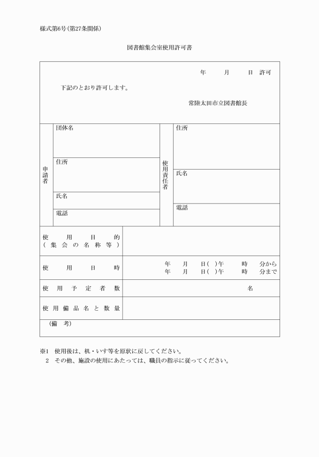 第27条 集会室を使用しようとする者は、あらかじめ図書館集会室使用申請書(様式第5号)を館長に提出し、その許可を受けなければならない。