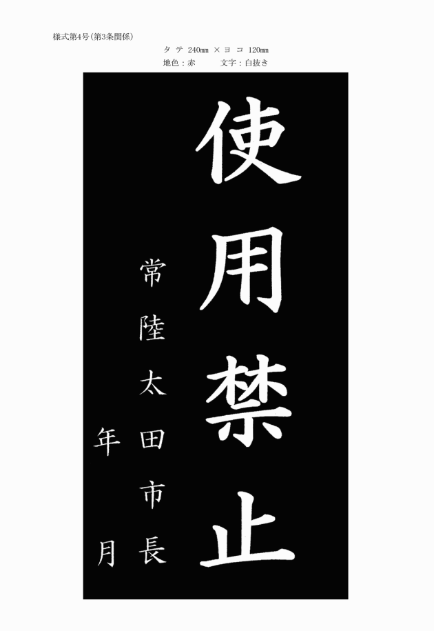 5 法第81条第1項の規定による命令をした場合には、様式第9号による是正を命じた旨の標識を設置するとともに、その旨を公告しなければならない。なお、水道事業者等に供給保留の要請をした場合は、その旨も記載するものとする。