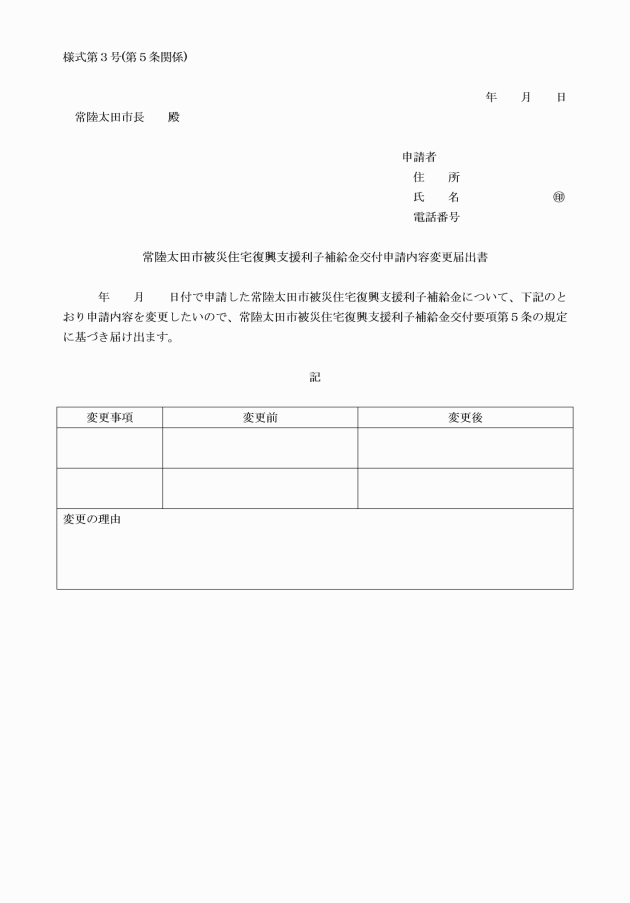 第5条 利子補給を受けようとする者(以下「申請者」という。)は住宅復興資金を借り受けた後、常陸太田市被災住宅復興支援利子補給金交付申請書(様式第1号)に、次に掲げる書類を添付して市長に申請しなければならない。