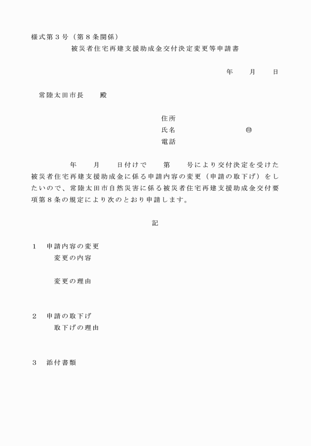 第6条 助成対象者が助成金の交付を受けようとするときは、被災者住宅再建支援助成金交付申請書(様式第1号)に、次の書類を添付して市長に提出しなければならない。