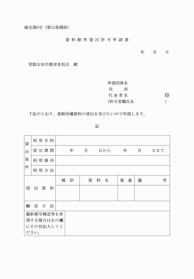 第13条 教育委員会は、次の各号に掲げるときに限り資料の貸出をすることができる。ただし、資料館で寄託及び借用している資料の貸出は行わない。